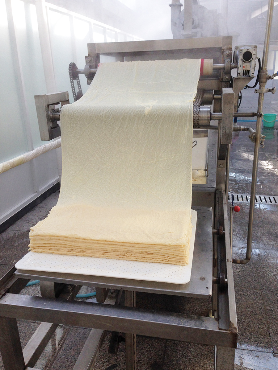 該設(shè)備由傳送皮帶、烘干機(jī)、蒸發(fā)鍋、傳送電機(jī)、冷風(fēng)管、電控箱、蒸汽表等部分組成。此設(shè)備為自動流水線設(shè)備,豆?jié){放入蒸發(fā)鍋后,經(jīng)保溫吹涼過程,將鍋表面結(jié)皮的產(chǎn)品送入輸送帶,自動卷起、烘干一體機(jī),如此反復(fù),至將豆?jié){全部加工完畢。
